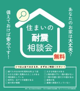11月のリノベ相談会では、無料で簡易耐震診断も行います。建築士が個別に耐震に関する相談をお受けしますので、耐震診断・耐震改修に興味のある方、お家の耐震性が心配な方、この機会にぜひご利用ください。