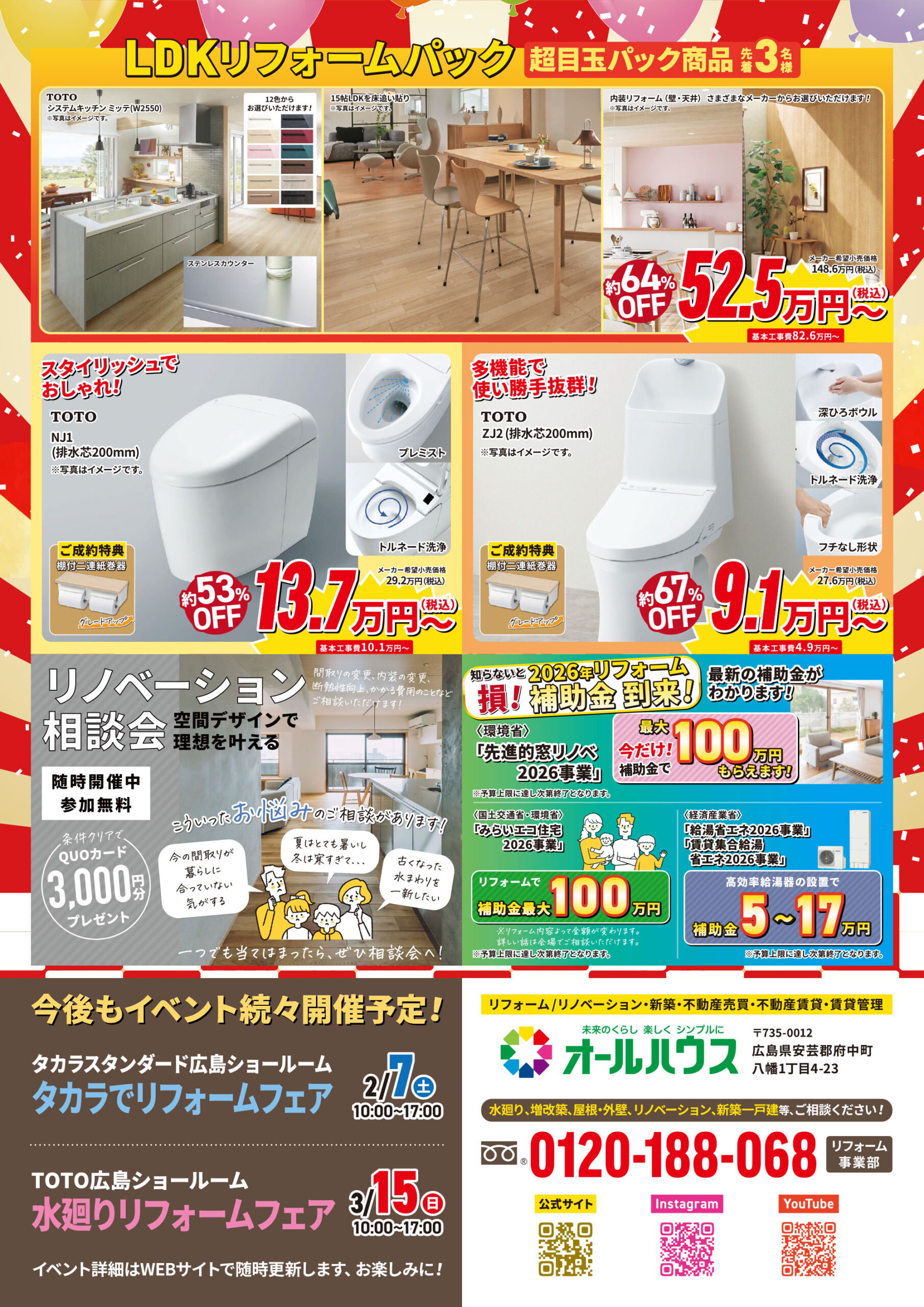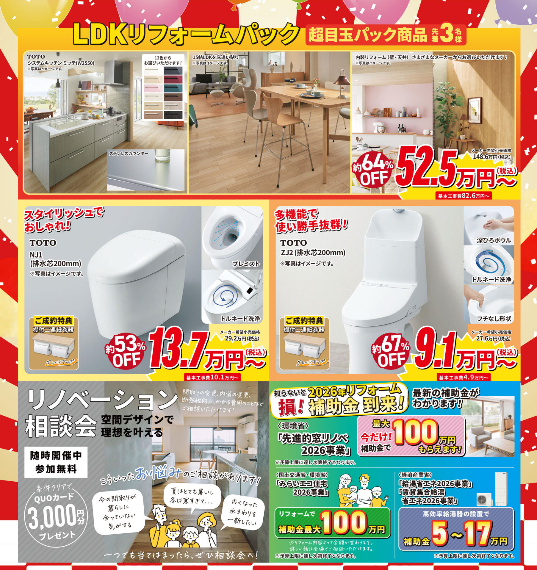 2026年もサッシの交換や内窓、節水型トイレや断熱浴槽などに補助金がでます。当日は最新補助金を活用したリフォームもご相談いただけます。